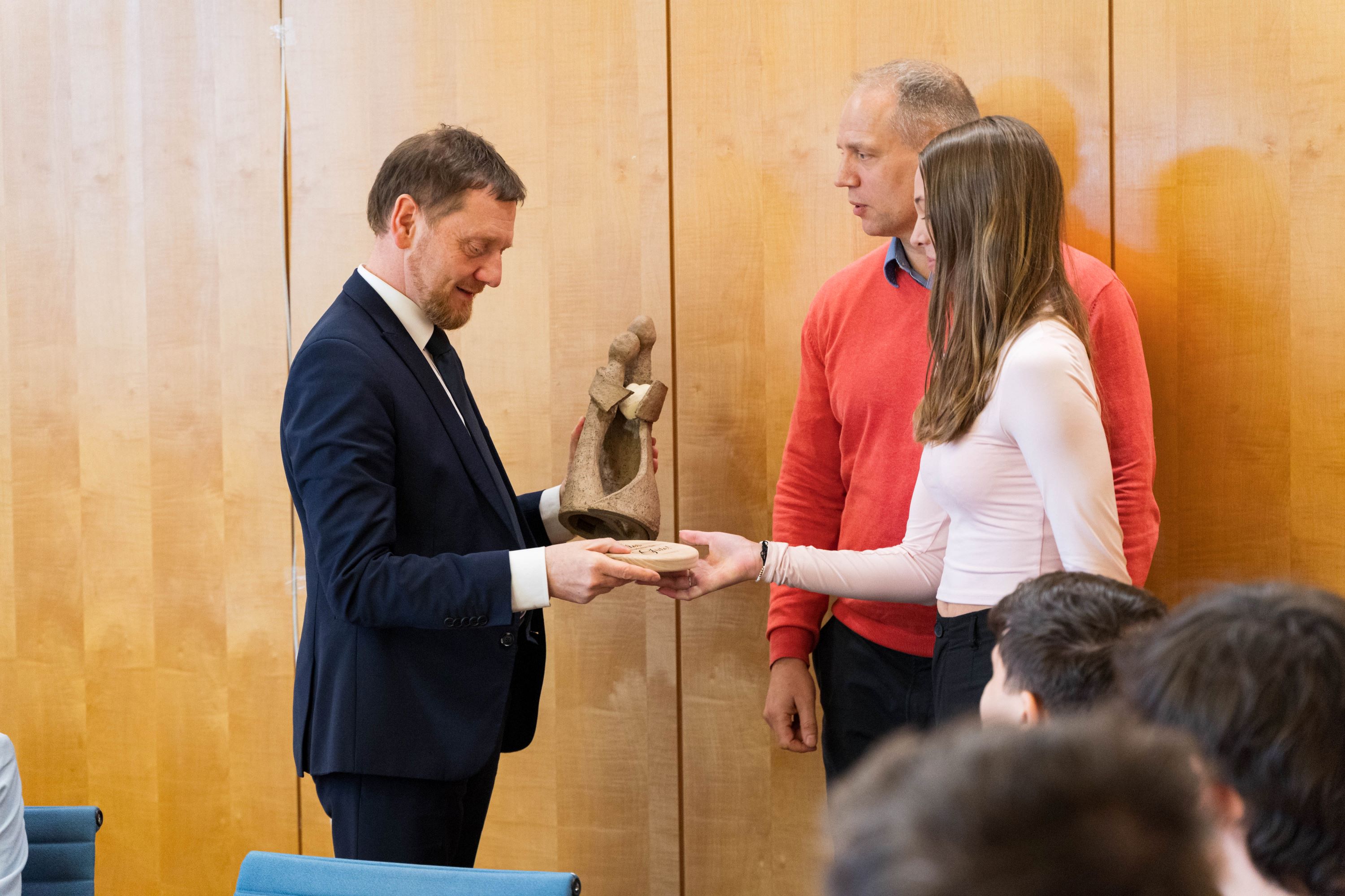 Am 28. Januar besuchten die Schüler unseres Beruflichen Gymnasiums die Sächsische Staatskanzlei im Rahmen des Faches Geschichte/Gemeinschaftskunde. Nach einer Führung durch das historische Gebäude der Staatskanzlei wurden Sie vom sächsischen Ministerpräsidenten Michael Kretschmer empfangen. Im Gespräch mit dem Ministerpräsidenten stellten die Schüler ihre Fragen zur aktuellen politischen Lage und zu gesellschaftlichen Themen und erfuhren so aus erster Hand unter anderem über die Arbeit der neuen Koalition in Sachsen. Als Dankeschön überreichte der Fachlehrer Herr Eichelkraut eine symbolkräftige Keramikfigur und eine Holzscheibe mit der Jahreslosung. Beides wurde in den Werkstätten des OVV gefertigt.